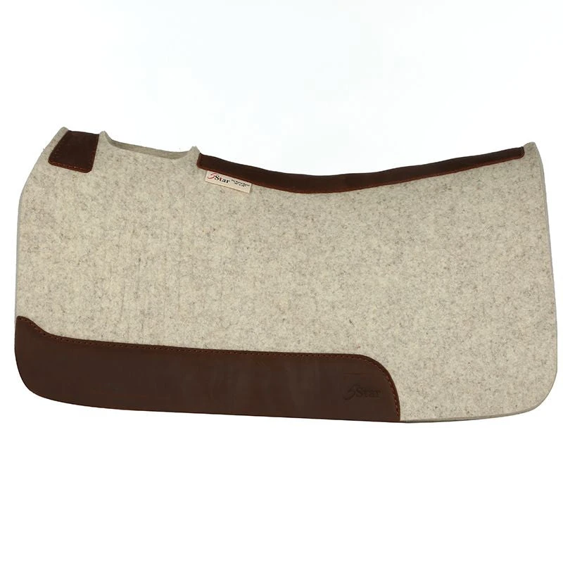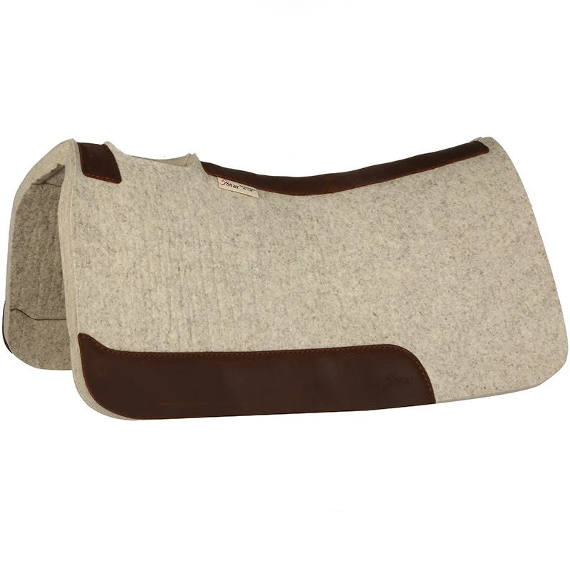 The Barrel Racer 5 Star Horse Saddle Pad is a great pad for Barrel Racing and Smaller Saddles. It keeps your horse comfortable and your saddle in place allowing the best performance from your horse! The 100% pure virgin wool felt wicks away moisture, cleans up easily and stabilizes your saddle with limited cinching. Wear leathers provide protection and durability. Hand-made in the USA!