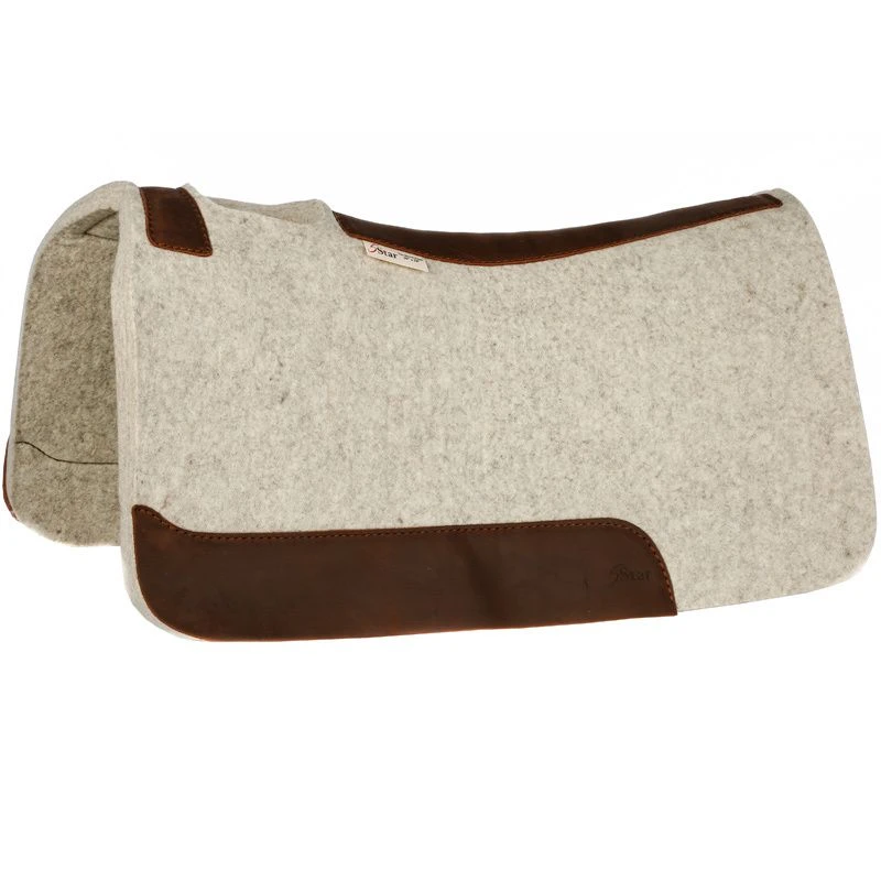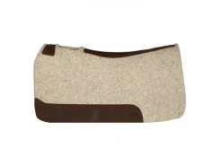 The Barrel Racer 5 Star Horse Saddle Pad is a great pad for Barrel Racing and Smaller Saddles. It keeps your horse comfortable and your saddle in place allowing the best performance from your horse! The 100% pure virgin wool felt wicks away moisture, cleans up easily and stabilizes your saddle with limited cinching. Wear leathers provide protection and durability. Hand-made in the USA!