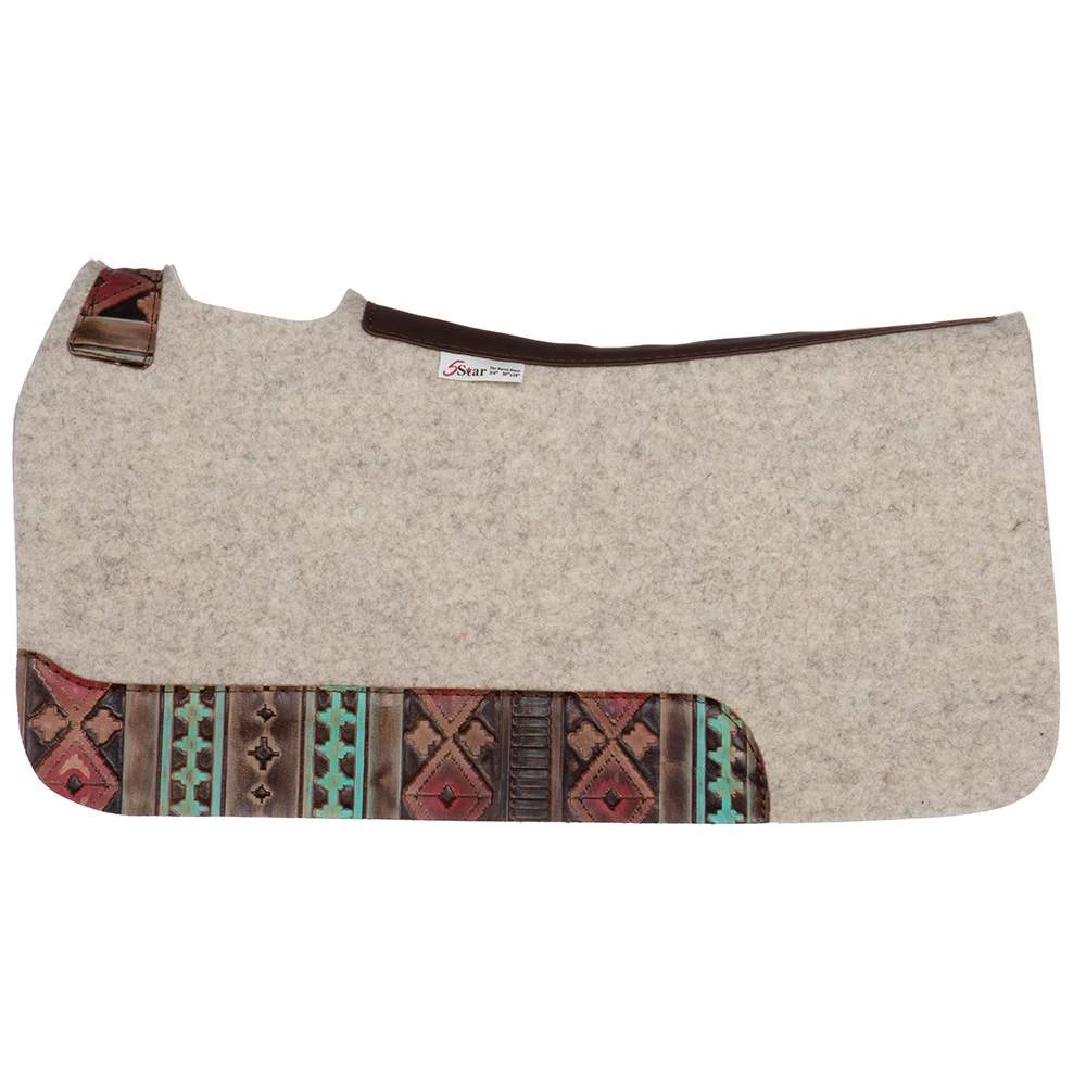 The Barrel Racer 5 Star Saddle Pad is an excellent choice for Barrel Racing and Smaller Saddles, providing comfort to your horse and keeping your saddle in place for optimal performance. Made of 100% pure virgin wool felt, this pad wicks away moisture, making it easy to clean, and ensures saddle stability with minimal cinching. Features a unique turquoise and red embossed navajo aztec wear leather! Hand-crafted in the USA, the pad is available in Natural, Black, Cinnamon, Dark Chocolate, Turquoise, Hot Pink, and Red colors, with a square skirt measuring 30″ wide x 28″ long or a round skirt. The product number for this 5 Star Equine The Barrel Racer 3/4 Inch Natural Felt Saddle Pad with Navajo Wear Leathers is 3WN-B-R-S97.