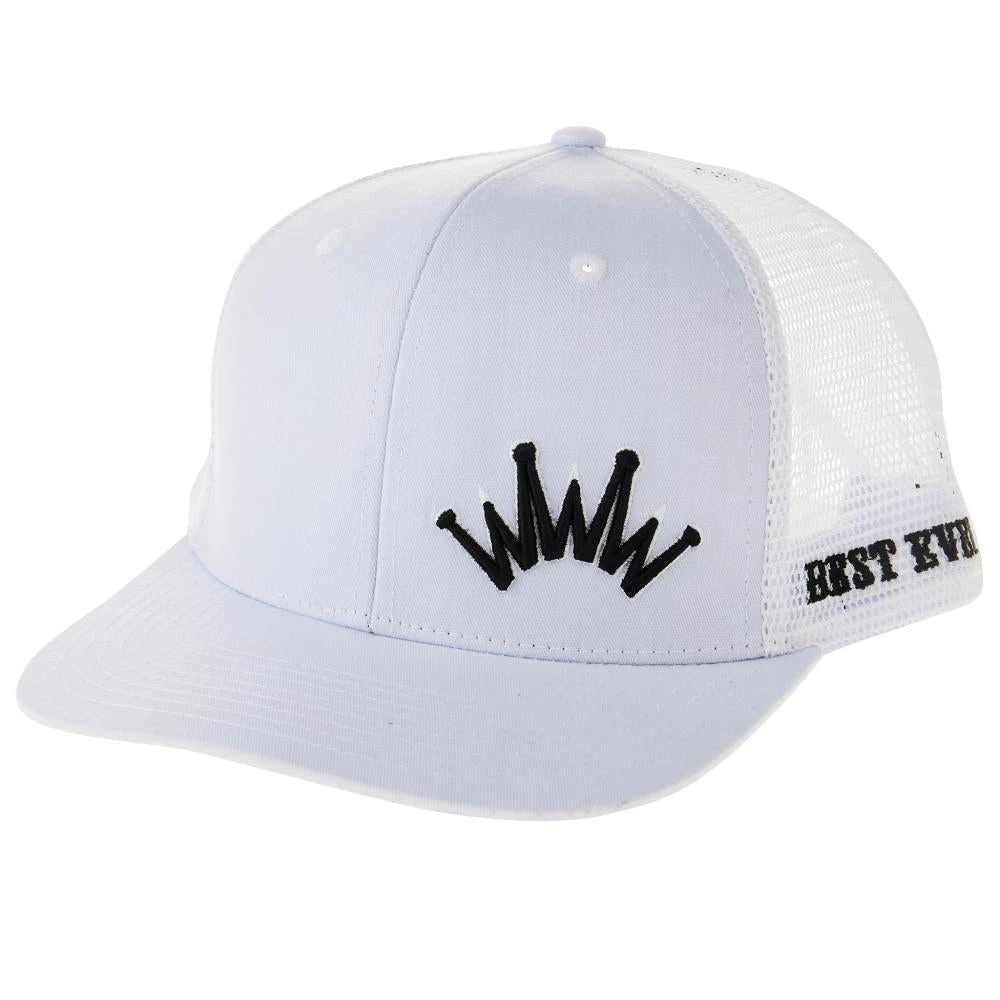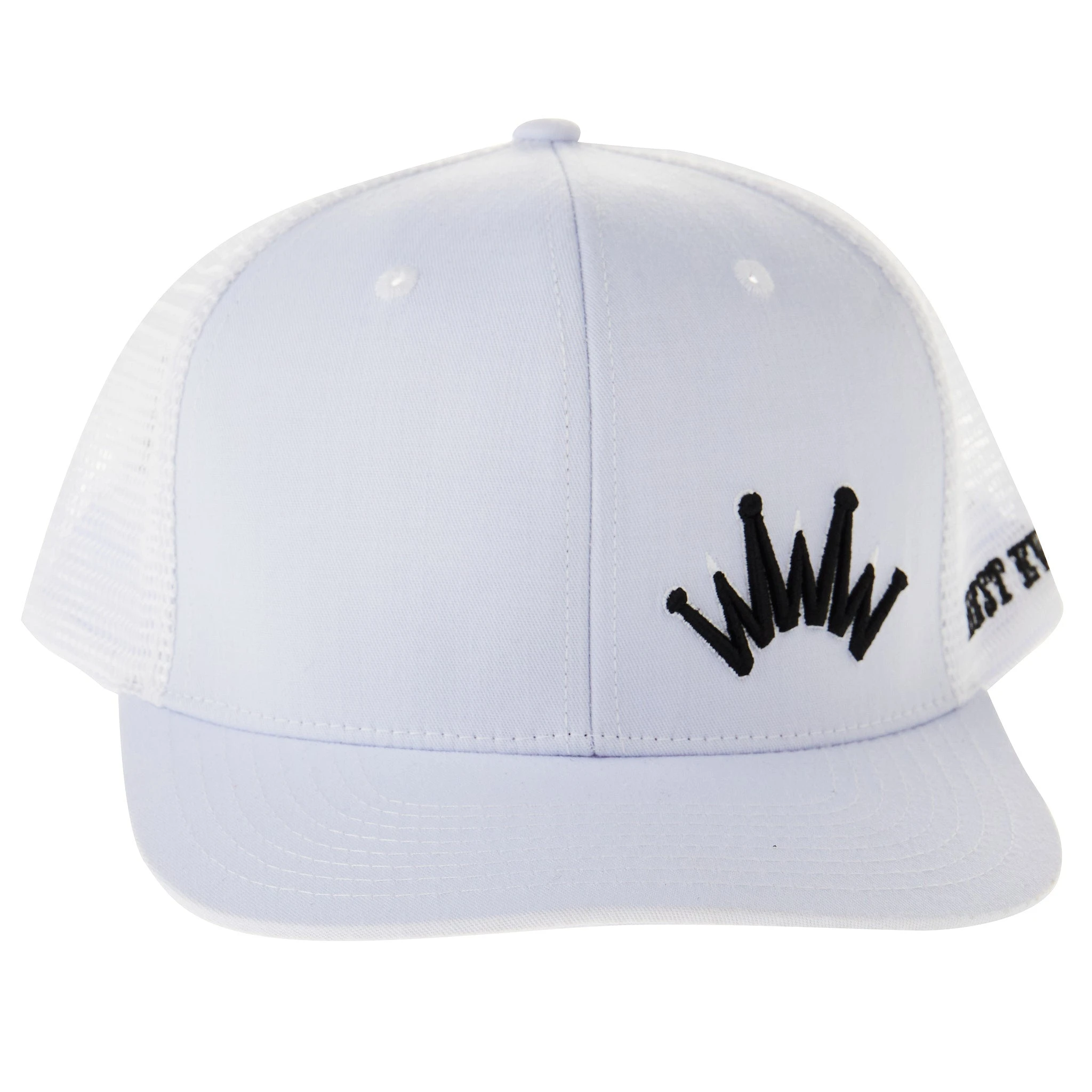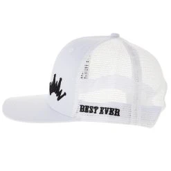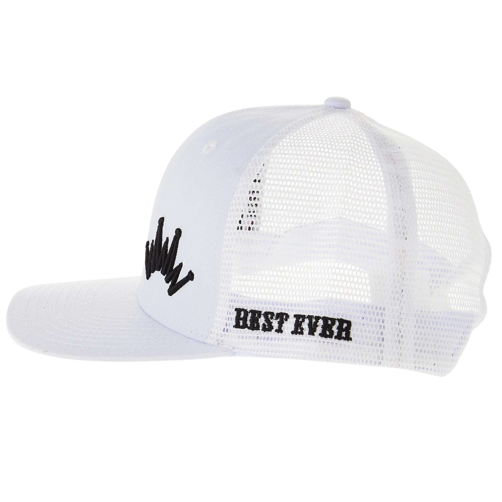 - This snapback cap features a white front, white mesh back, and black embroidered Best Ever crown logo.