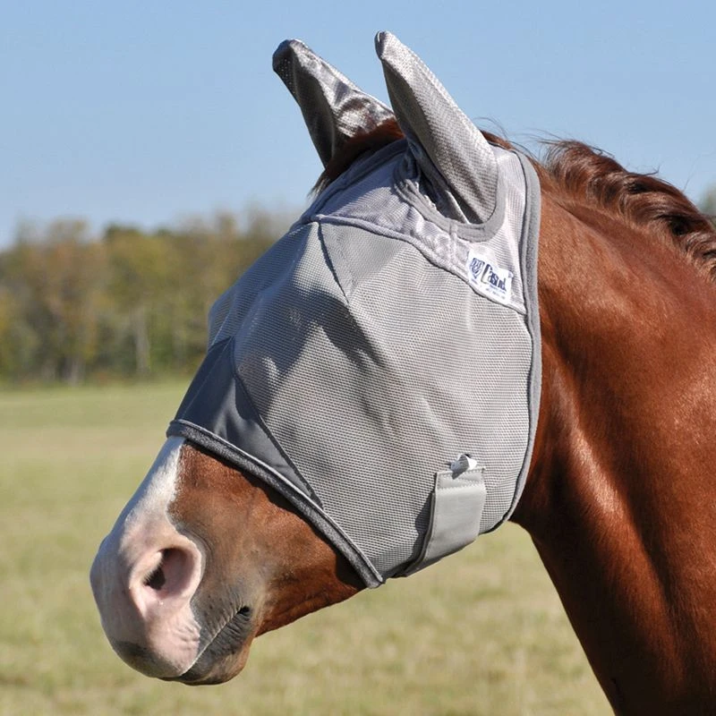 Spoil your horse in the pasture with a full length fly mask. A safe alternative to toxic fly sprays. With its patented three hole cap that eliminates forelock damage and unique design that keeps the mesh well away from the eye area, your Crusader is one of the most comfortable masks available. The plastic coated mesh is durable and blocks 70% of damaging UV rays. The long nose panel protects white noses from sunburn and biting flies. Made from soft nylon micro mesh, the ears keep biting gnats from torturing your horse. Gray mesh with gray trim.