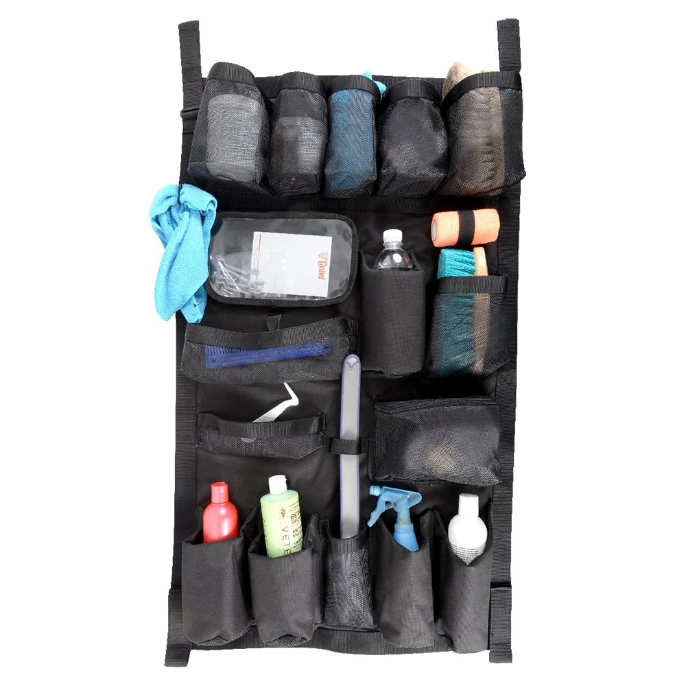 The ultimate tool for organizing your barn or trailer. Different sized pockets maximize convenience and optimize space. Items stay in pockets due to the special square bottom design. The unique removable zippered pocket on the half and full versions is great for show and health papers during check-in. Mounting hardware included with double S closure for added security when hanging.