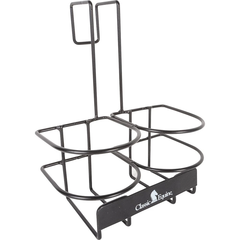 Keep your barn more organized with the Classic Equine bottle hanger. It is made of durable metal and holds 2 32oz bottles for fly spray, detangler, shampoo, conditioner or water. It fits over most standard stall fronts and panels for easy access.