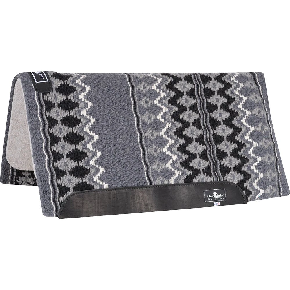 The Classic Equine wool top western saddle pads have a top layer that is a heavy, custom weave 100% New Zealand wool blanket which is long lasting, durable and good looking. 3/4” orthopedic grade felt bottom soaks up moisture, allowing heat to dissipate away from the horse’s back with oil tan wear leathers. This Pad Conforms to the horse’s back while maintaining density Convenient one-pad system perfect for all disciplines.