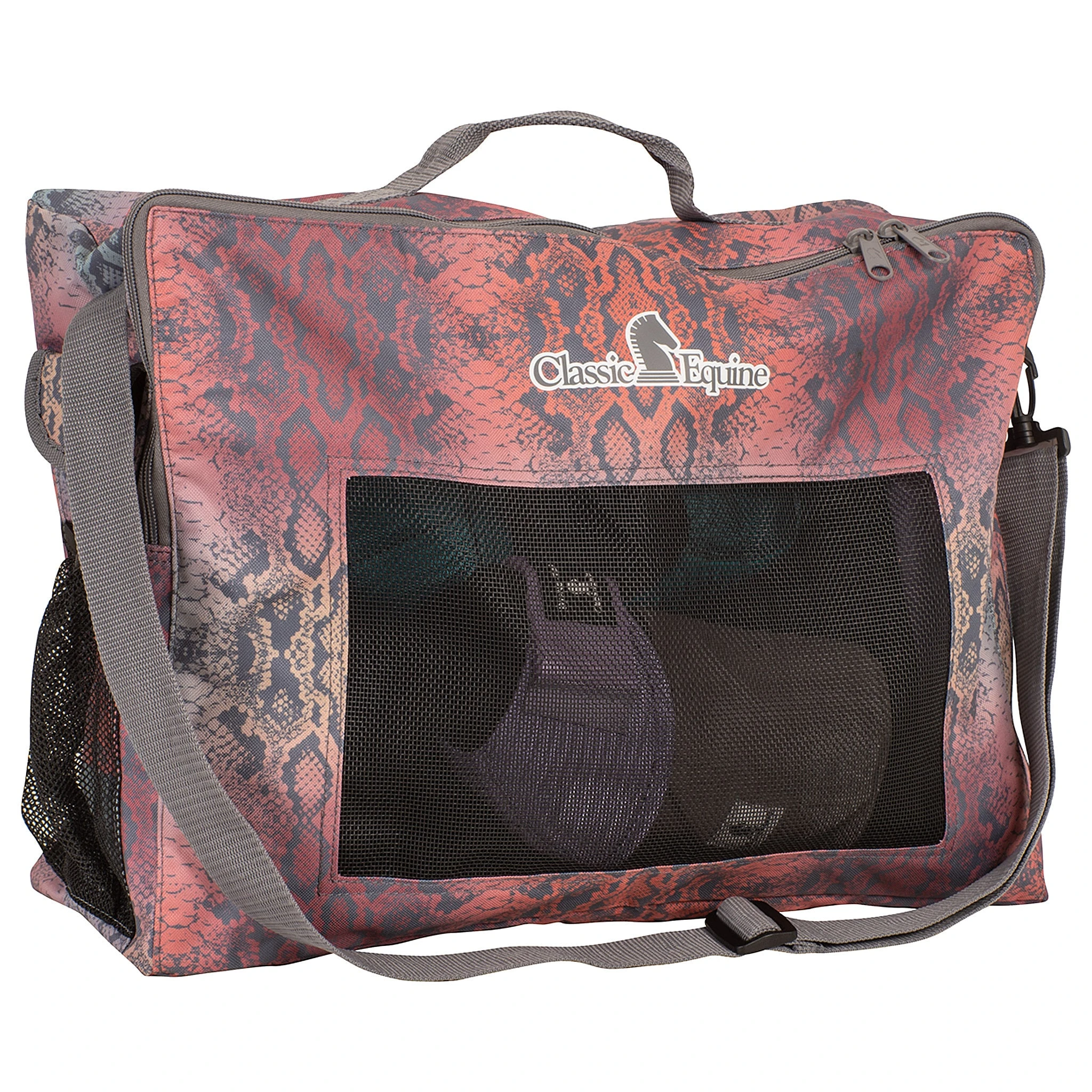 The Classic Equine boot accessory tote is made of a tough nylon shell with PVC mesh on sides and bottom to allow dirt to escape. Pockets of various sizes secure cell phones, water bottles, and other necessities. Nylon webbing handle and shoulder strap. Double zipper closure.