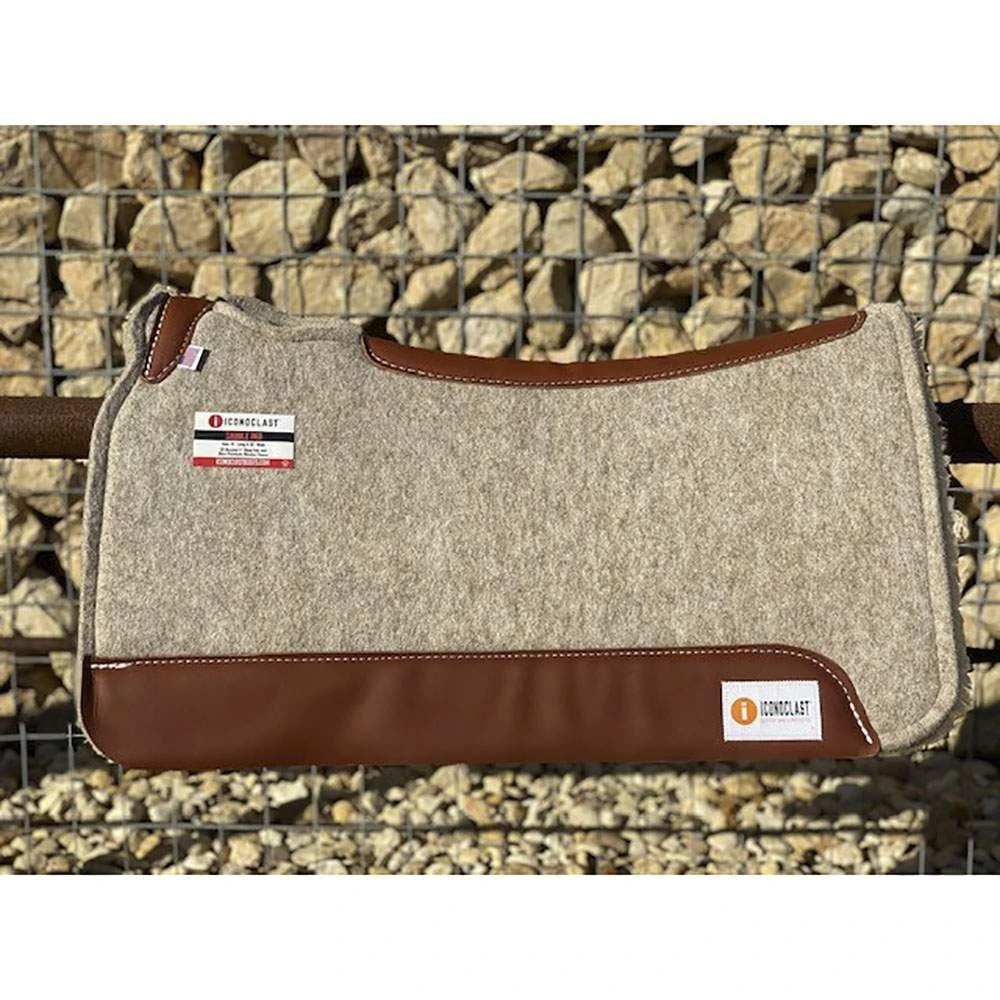 You love how their leg protective gear cares for your horses legs, now fall in love with how Iconoclast’s newest addition protects your horses back!!!Introducing the new all natural saddle pad by Iconoclast. This pad is made with all natural materials and has some great features. The leather wear guards, tailored leather front yoke and leather spine reinforce the already outstanding construction of this pure pad. The wool felt base is 7/8″ thick and is compression resistant. This pad also comes with two valuable features, a 100% Wool fleece liner and a knife pocket! The measurements are 31″ x 31″