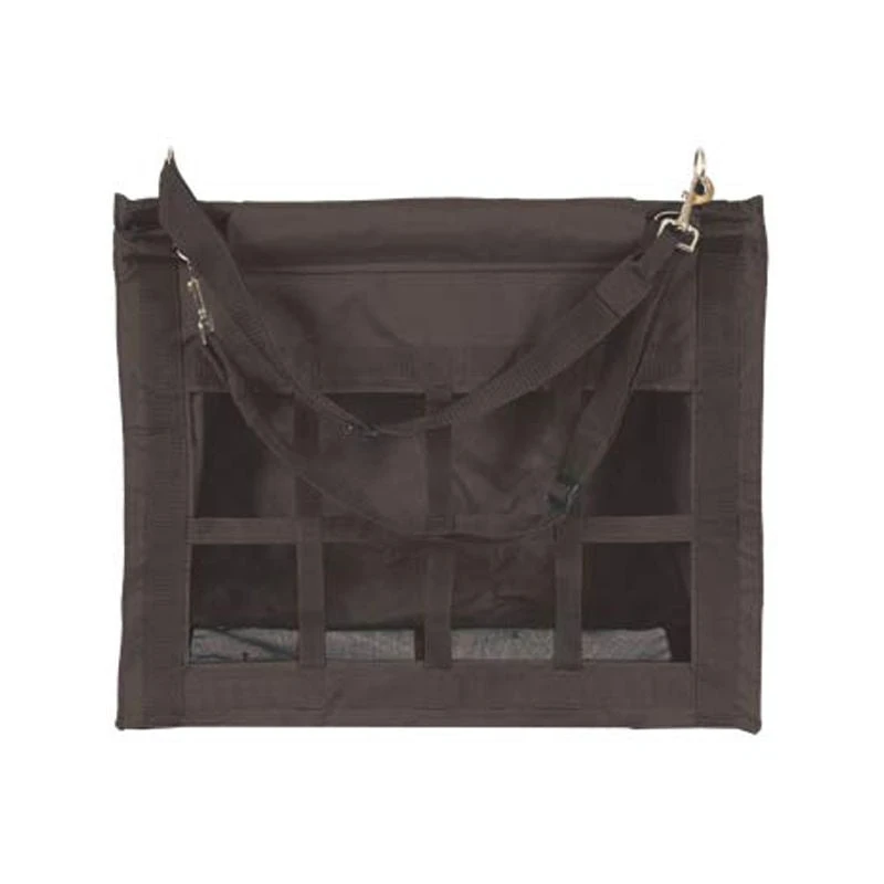 This Deluxe Top Load Hay Bag is extra large making it very easy to fill. It features a top flap that velcros shut so hay can’t be drug out of the top. It also features a long adjustable strap with snaps making it easy to hang almost anywhere. The hay must be pulled from the webbed squares in front which lessens waste. The front and back are made of tough poly for durability and the bottom is mesh allowing dust and dirt to fall through.