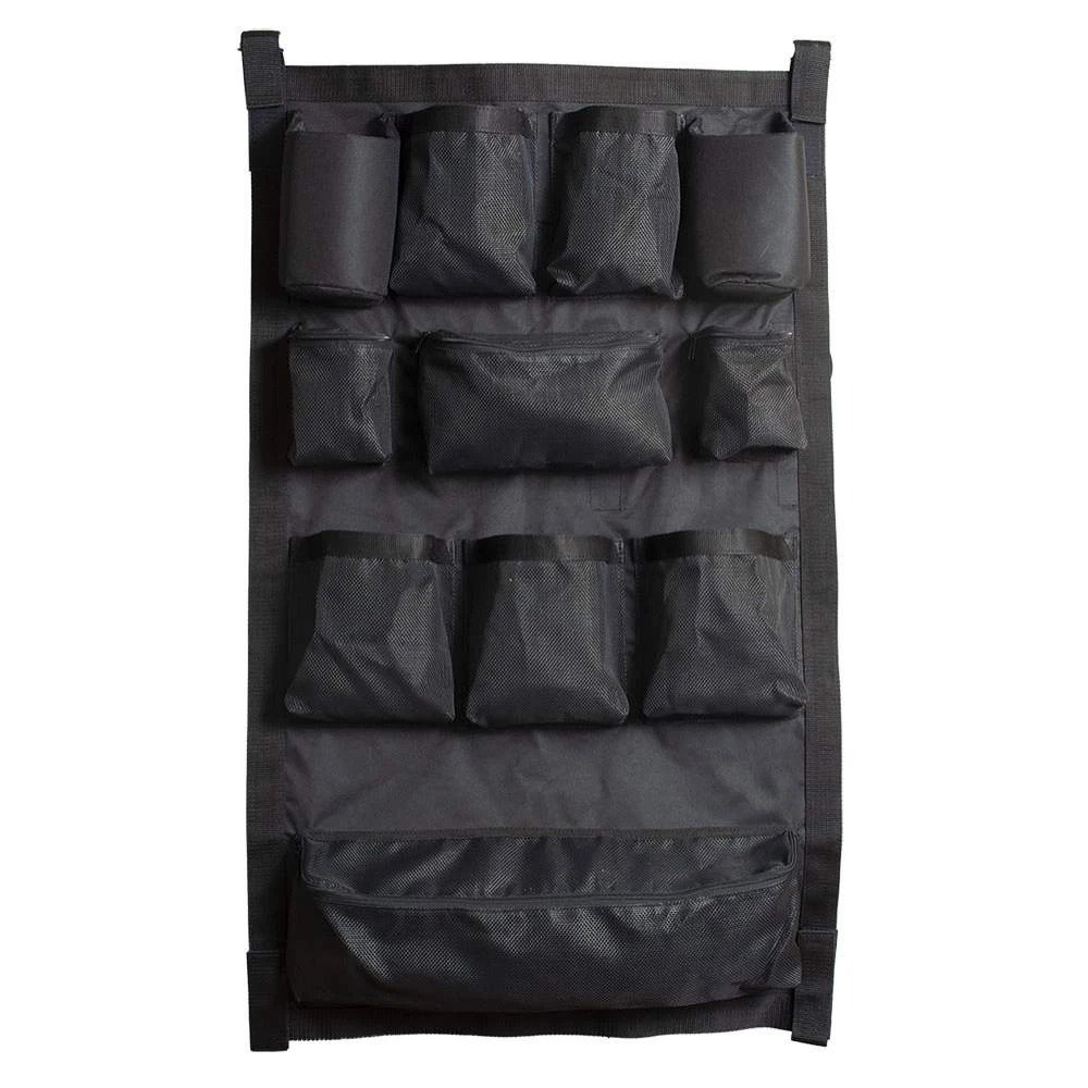 Keep your barn, stalls or trailer organized with the 600 denier and mesh Mustang trail grooming organizer bag. Bag features 5 open top mesh compartments, 2 large padded compartments, and 4 mesh with zipper top compartments. Bag also features a sleeve on the back of the bag to conveniently hold a notebook or clipboard. Straps feature hook and loop closures for easy hanging. Size 39″ long x 32″ wide.