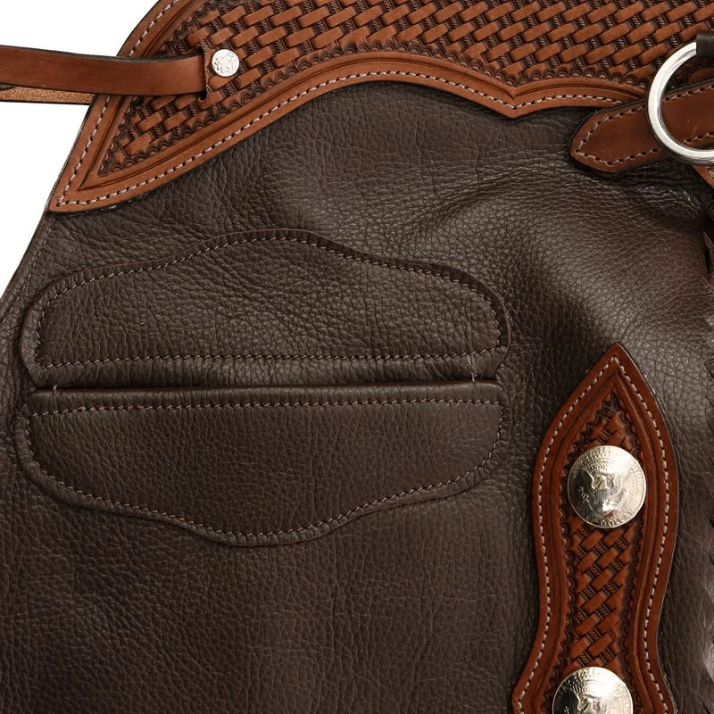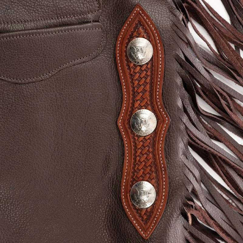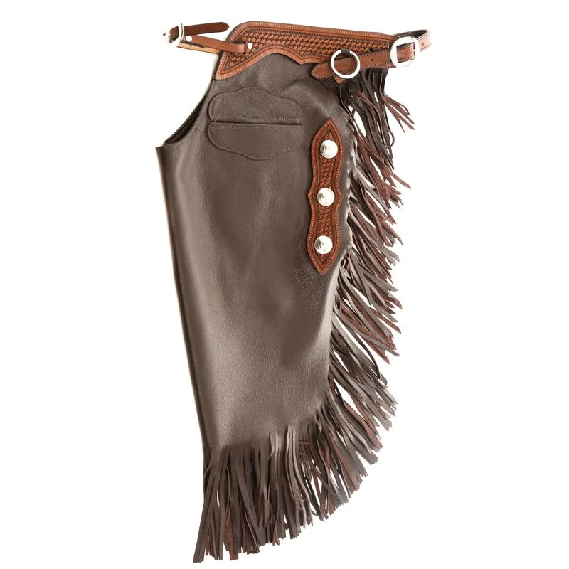 Handmade in the USA using heavy weight leather for durability in the toughest of extremes. Hand-sewn welt pockets allow for quick and easy access even when in the saddle. Chaps and chinks come with stainless rings in order to easily pack a tie-string.