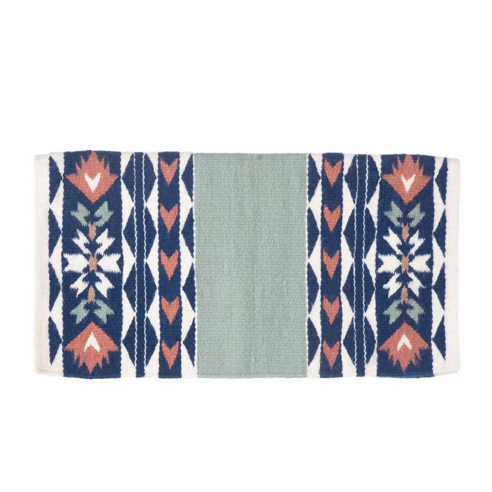 The NRS Exclusive Thistle Pattern Seafoam/Coral Color Saddle Blanket is a unique design to go directly under your felt pad in the arena or on top of your felt pad in a show ring. This blanket is hand woven out of new zealand wool. We have a limited supply of this wool blanket!