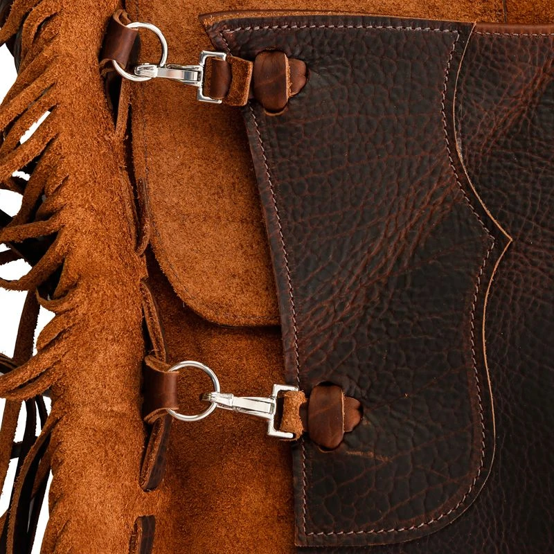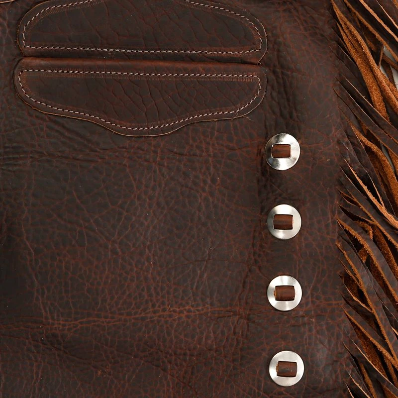 Handmade in the USA using heavy weight leather for durability in the toughest of extremes. Hand-sewn welt pockets allow for quick and easy access even when in the saddle. Chaps and chinks come with stainless rings in order to easily pack a tie-string. Mounted with stainless slotted conchos.