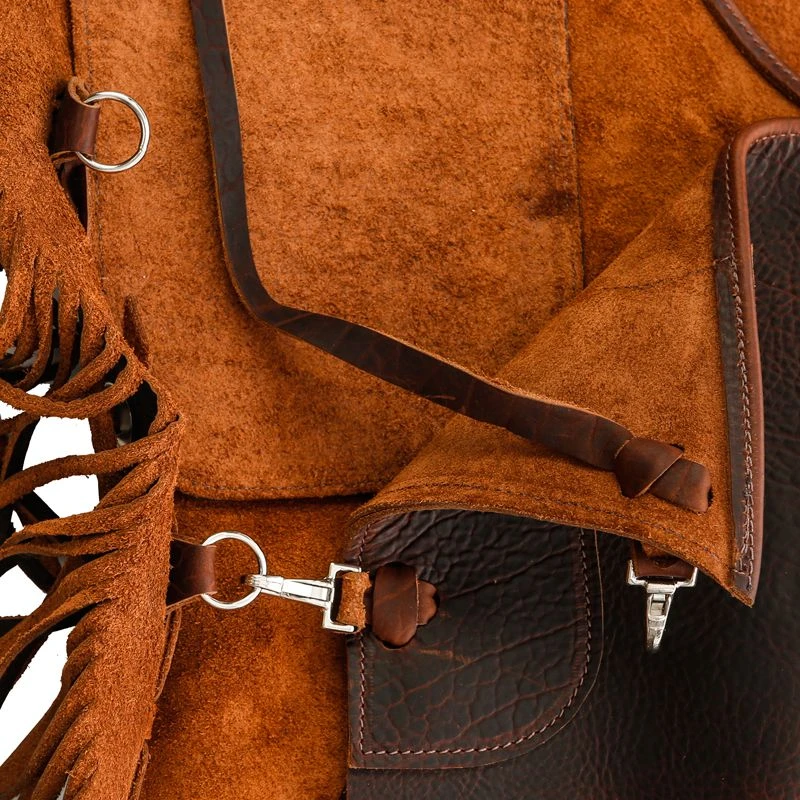 Handmade in the USA using heavy weight leather for durability in the toughest of extremes. Hand-sewn welt pockets allow for quick and easy access even when in the saddle. Chaps and chinks come with stainless rings in order to easily pack a tie-string. Mounted with stainless slotted conchos.