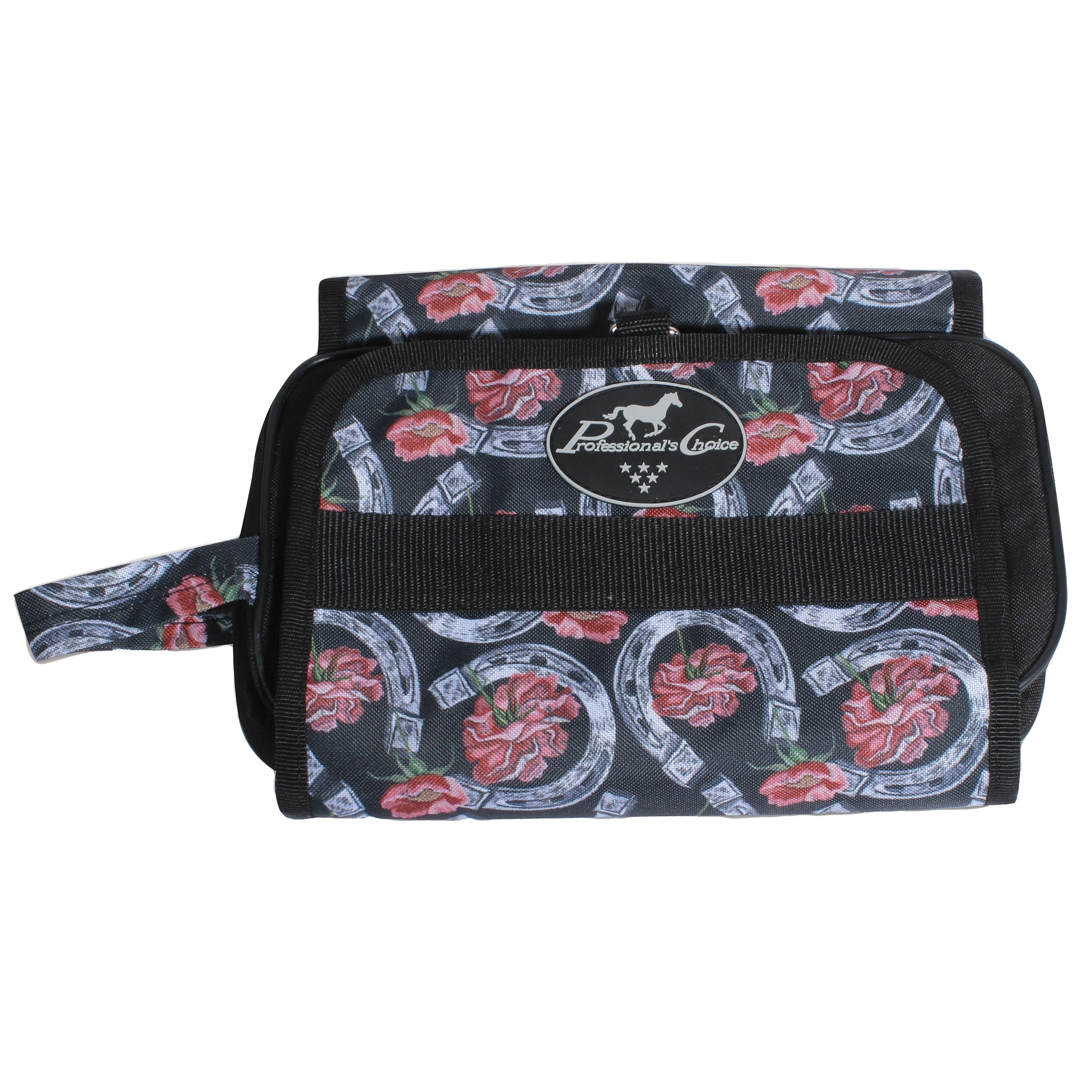 Foldable hanging bag with 4 zippered compartments. Metal hook for easy hanging and a handle for carrying when folded up.