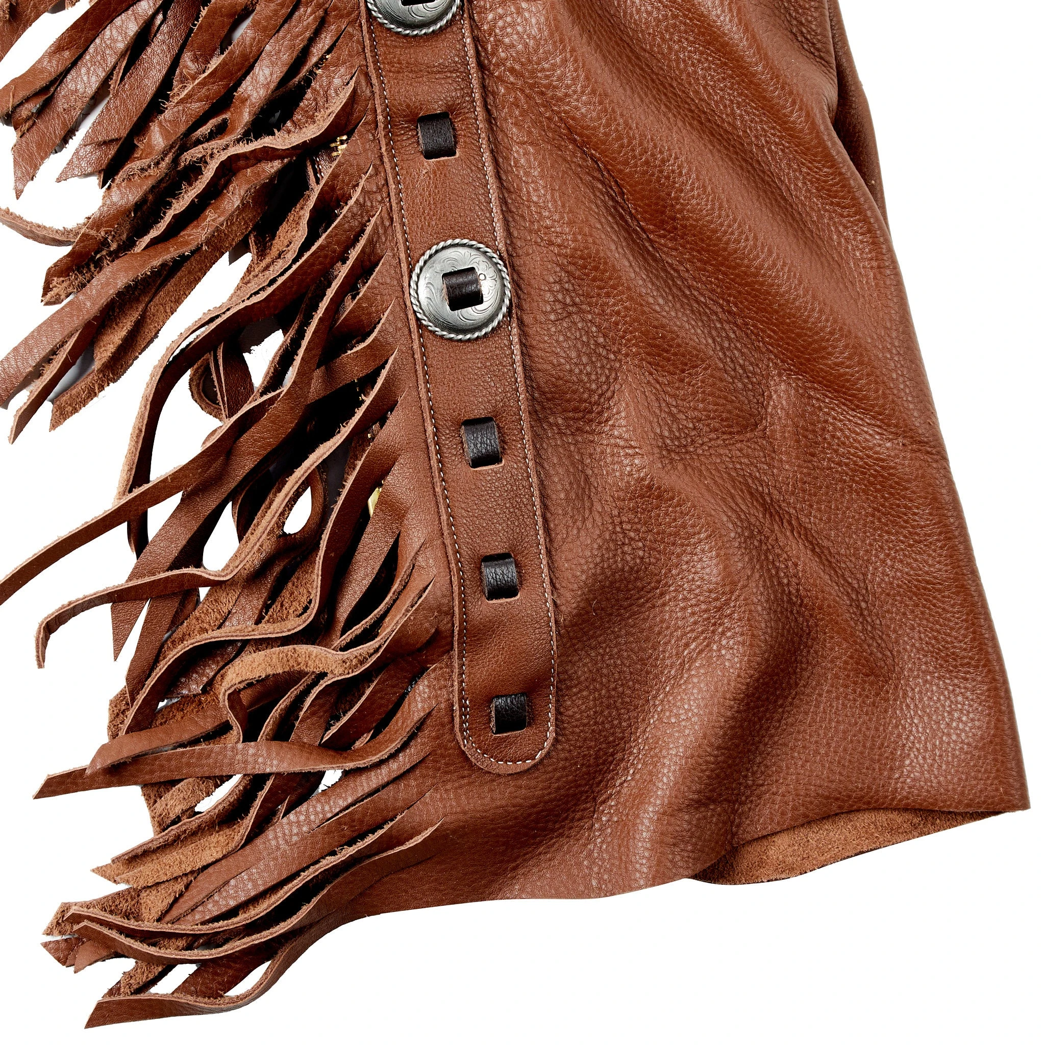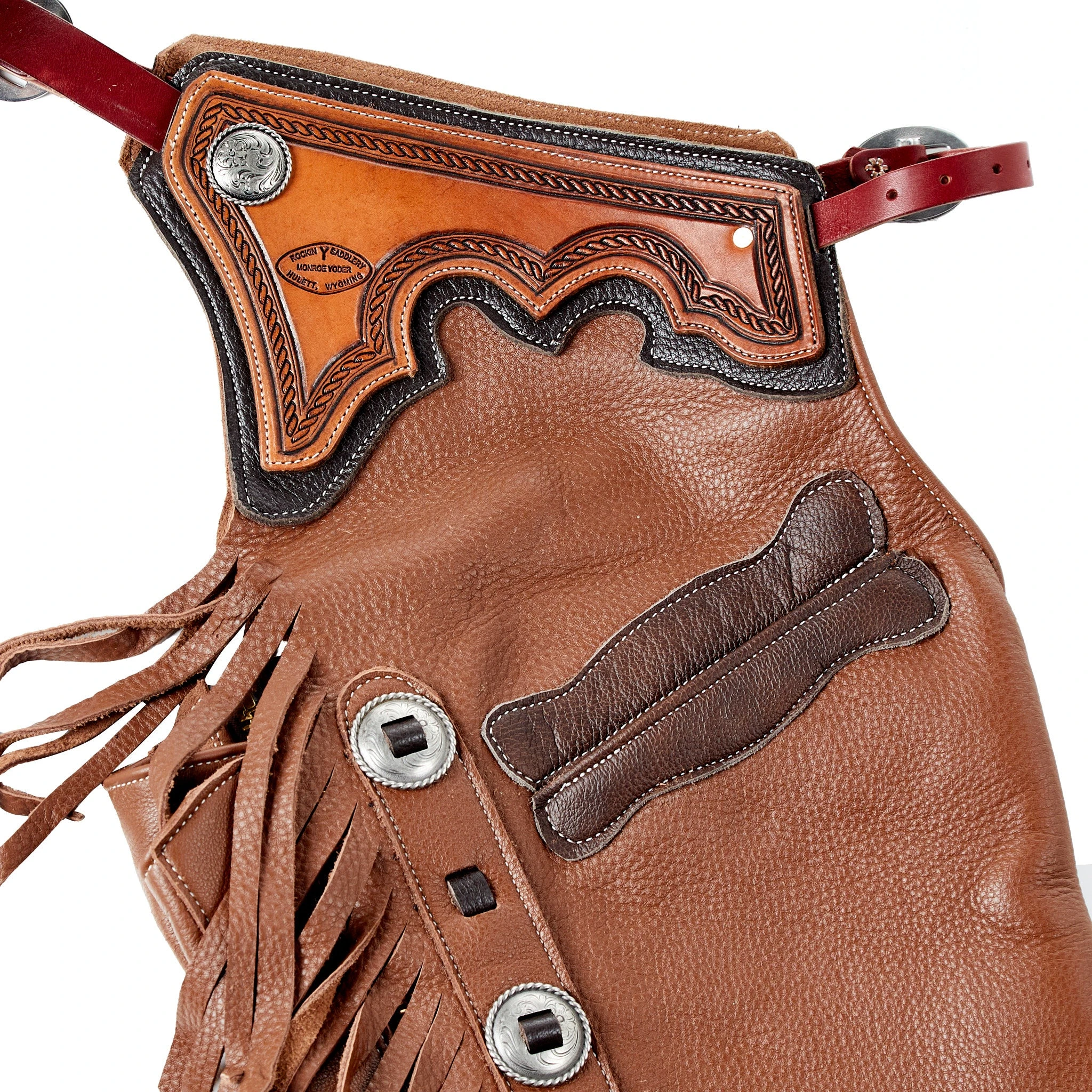 These beautiful handcrafted Rockin Y Shotgun Chaps are made form premium buckskin chap leather. It features dark brown accents with an exquisite rope edge border tooled yoke. The best part is these chaps have pockets! They are perfect for any day work or in the show pen. RY-SHOTGUN
