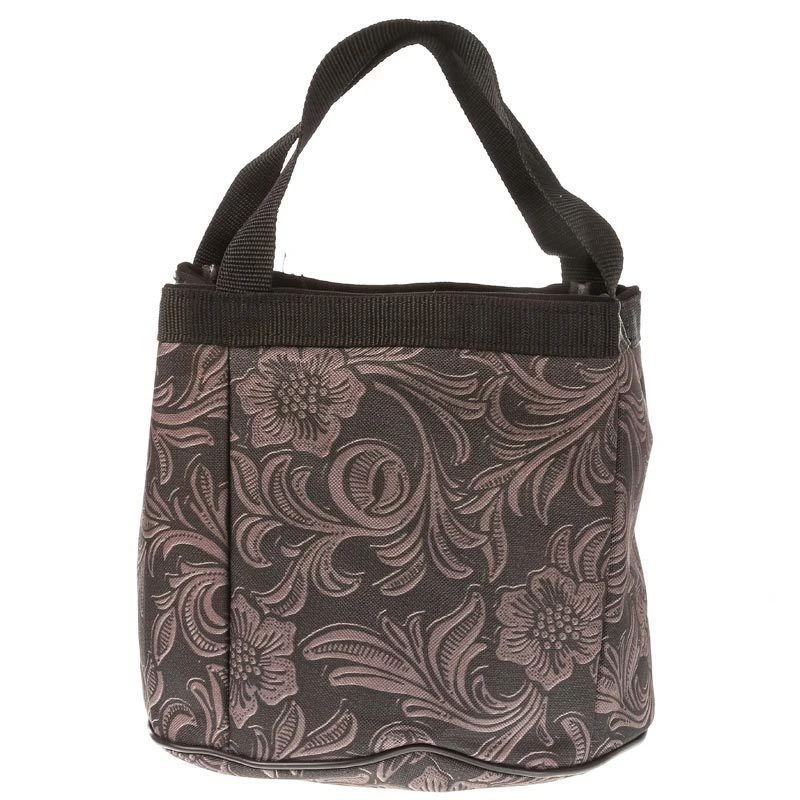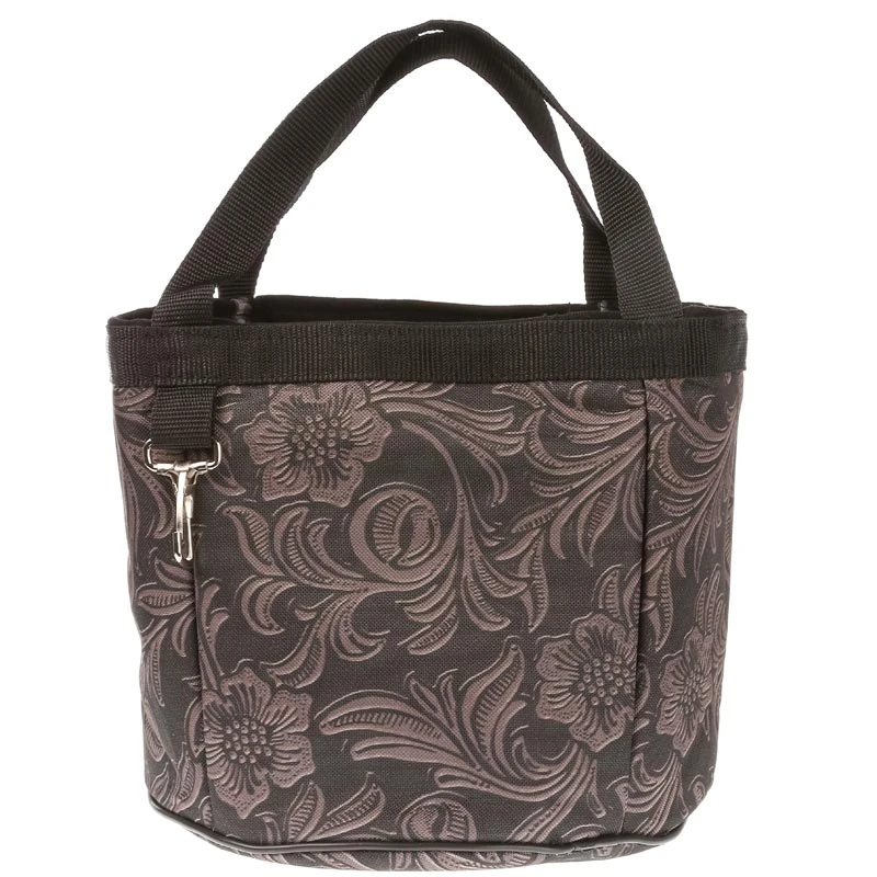 Tough nylon grooming caddy with multi-pockets inside to keep brushes and spray bottles upright. Also has spring snap on outside for hoof pick and more. Will hold most everything you need for the final touch.