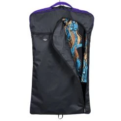 This garment bag makes storing your expensive show clothes easy and convenient! Our unique curved front zipper closure offers access to the contents easier than most. This bag also features a front zipper pocket for storing pins, magnets, or other accessories and slot at top for hanger access.