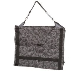 Easy to fill with extra large top. Heavy denier nylon with dividers and “quick grip” closures at top so hay can’t be drug out of the top. 10” wide mesh bottom. Adjustable hand straps with snap. 24” x 20